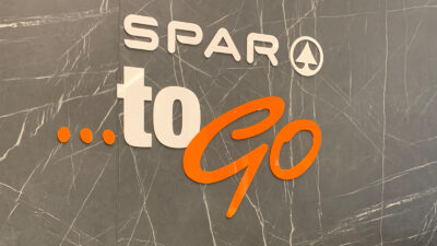 - Osvetlená tabuľa SPAR to Go s pretlačenými písmenami z akrylového skla
